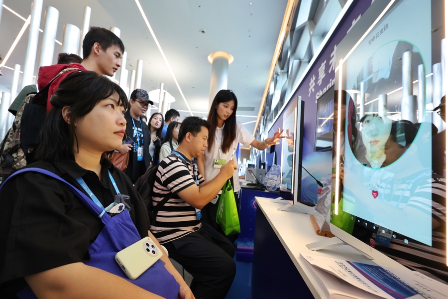 参观者在浦江论坛上体验智申花魔镜检查身体指标。