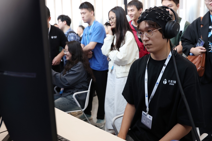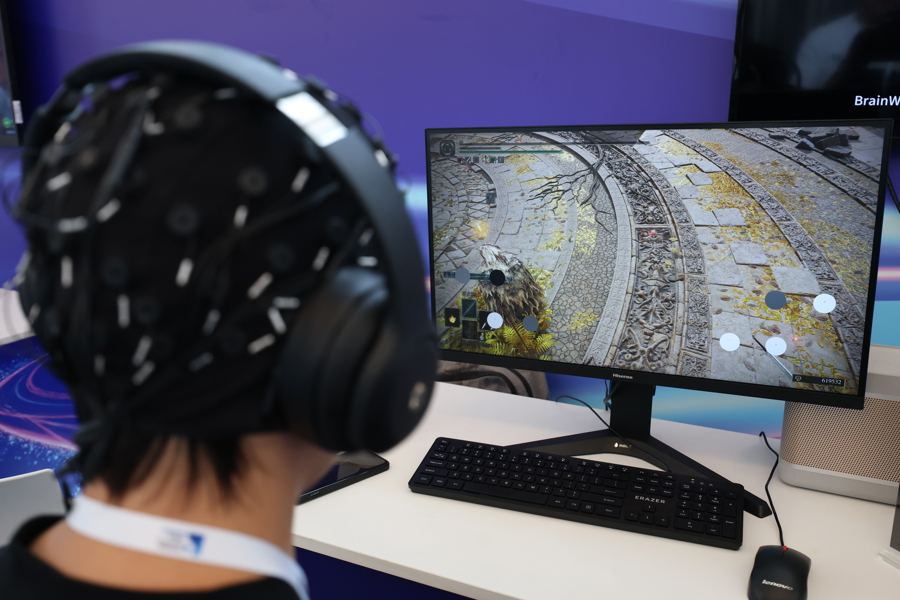 9月22日,在2025浦江创新论坛“共享未来体验区”,上海岩思类脑人工智能研究院的“非侵入式脑机接口玩游戏”项目,邀体验者戴上脑电采集帽,不用鼠标,凭意念玩《黑神话:悟空》。