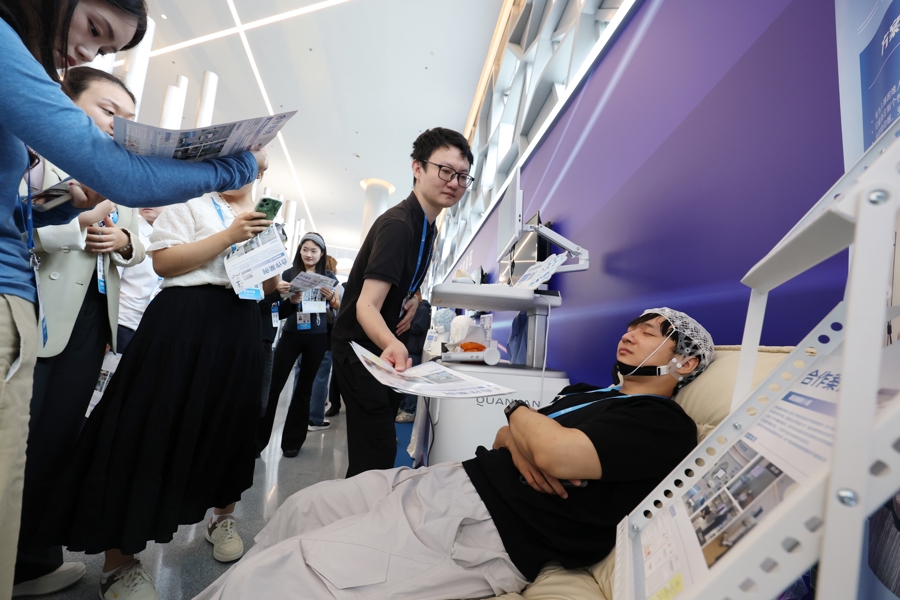 参观者在浦江论坛上体验一款集脑机技术于一体的睡眠小屋。